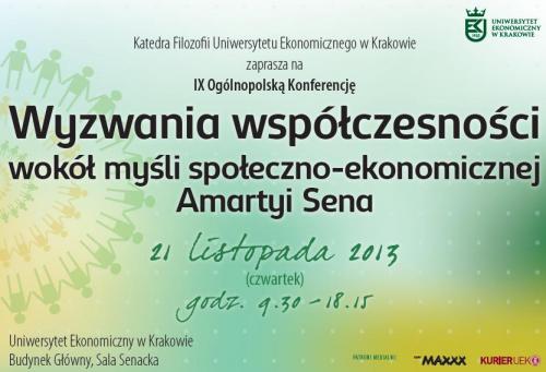 Konferencja odbędzie się w dniu 21 listopada 2013 r. Będzie to kolejna, dziewiąta już, ogólnopolska konferencja z zakresu szeroko rozumianej problematyki etyczno-biznesowej organizowana, w murach naszej uczelni, którą tym razem zamierzamy poświęcić związkom etyki i ekonomii, zaprezentowanych w pracach Amartyi Sena.